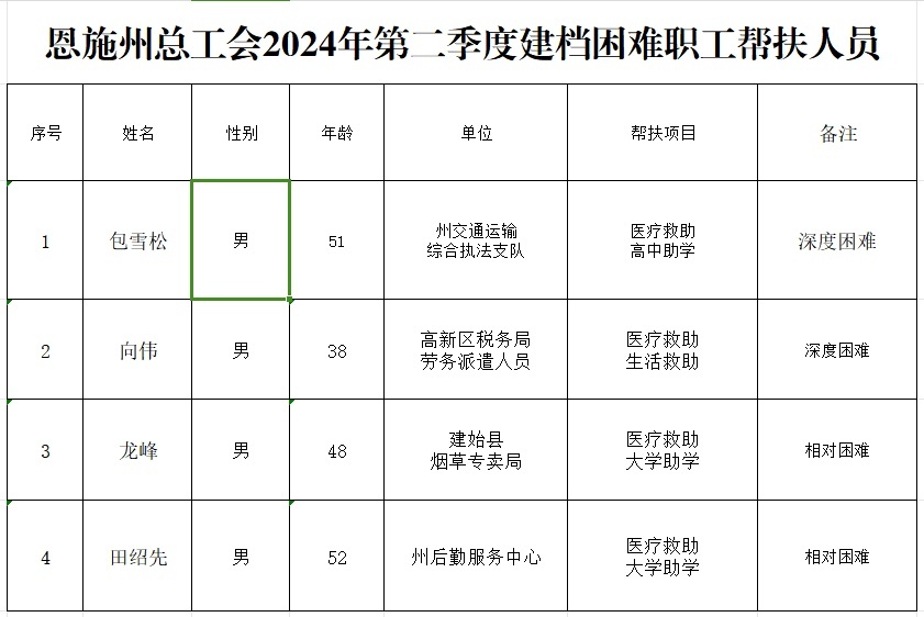 根据《关于印发〈湖北省工会困难职工档案管理实施细则〉〈湖北省工会困难职工专项帮扶资金使用管理实施细则〉〈湖北省工会送温暖资金使用管理实施细则〉的通知(鄂工办〔2020〕26 号)文件的有关精神,经基层工会申报,州总工会拟对4名家庭存在困难符合建档立卡条件的职工进行帮扶救助。