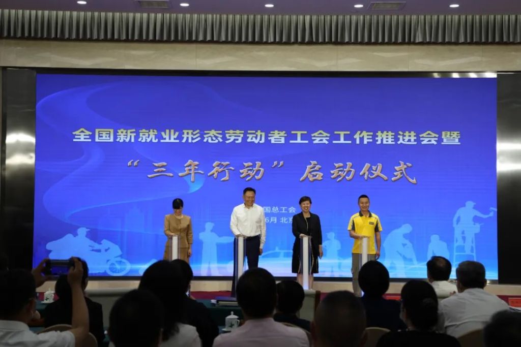 会上,徐留平与北京市人大常委会副主任、市总工会主席齐静,京东集团党委书记、工会主席缪晓虹,美团外卖骑手高丰共同启动“三年行动”。