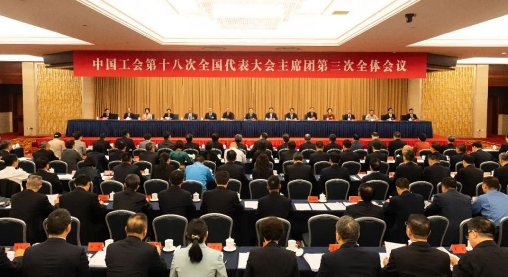 微信公众号中国工会第十八次全国代表大会主席团10月10日上午举行第三次全体会议。全国人大常委会副委员长、大会主席团常务主席王东明主持会议。