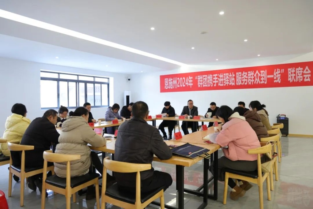 为进一步整合群团组织资源,发挥各自优势,携手为群众提供更优质、更便捷的服务,12月18日,恩施州总工会联合团州委、州妇联、州科协、州残联、州红十字会召开“群团携手进驿站 服务群众到一线”联席会议,共同协商研究全州群团携手进驿站服务工作。恩施市总工会、团市委、市妇联、市科协、市残联、市红十字会相关负责人,部分新就业形态劳动者代表参加会议。