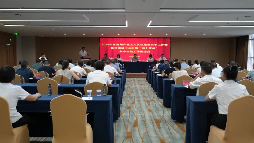 7月30日,2025年恩施州产业工人队伍建设改革工作暨新兴领域工会组织“两个覆盖”集中攻坚工作推进会在建始县召开。州人大常委会副主任、州总工会主席王新国出席会议并讲话,州总工会党组书记、常务副主席王兰英主持会议。州人社局、州经信局、州国资委、州总工会、恩施高新区、各县市总工会、人社局,建始县产改成员单位及部分企业的相关领导和负责同志参加会议。